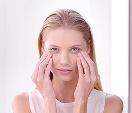 Drenar con las yemas de los dedos del interior hacia el exterior. Repetir 5 veces primero en la parte inferior y después en la parte superior de los ojos, del ángulo interno hacia las sienes para respetar el sentido de la circulación linfática.