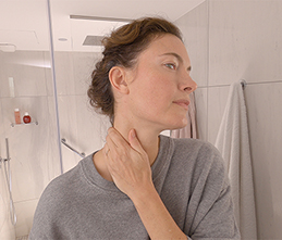 Usa las manos para distribuir el producto uniformemente por el rostro y el cuello. 8 segundos